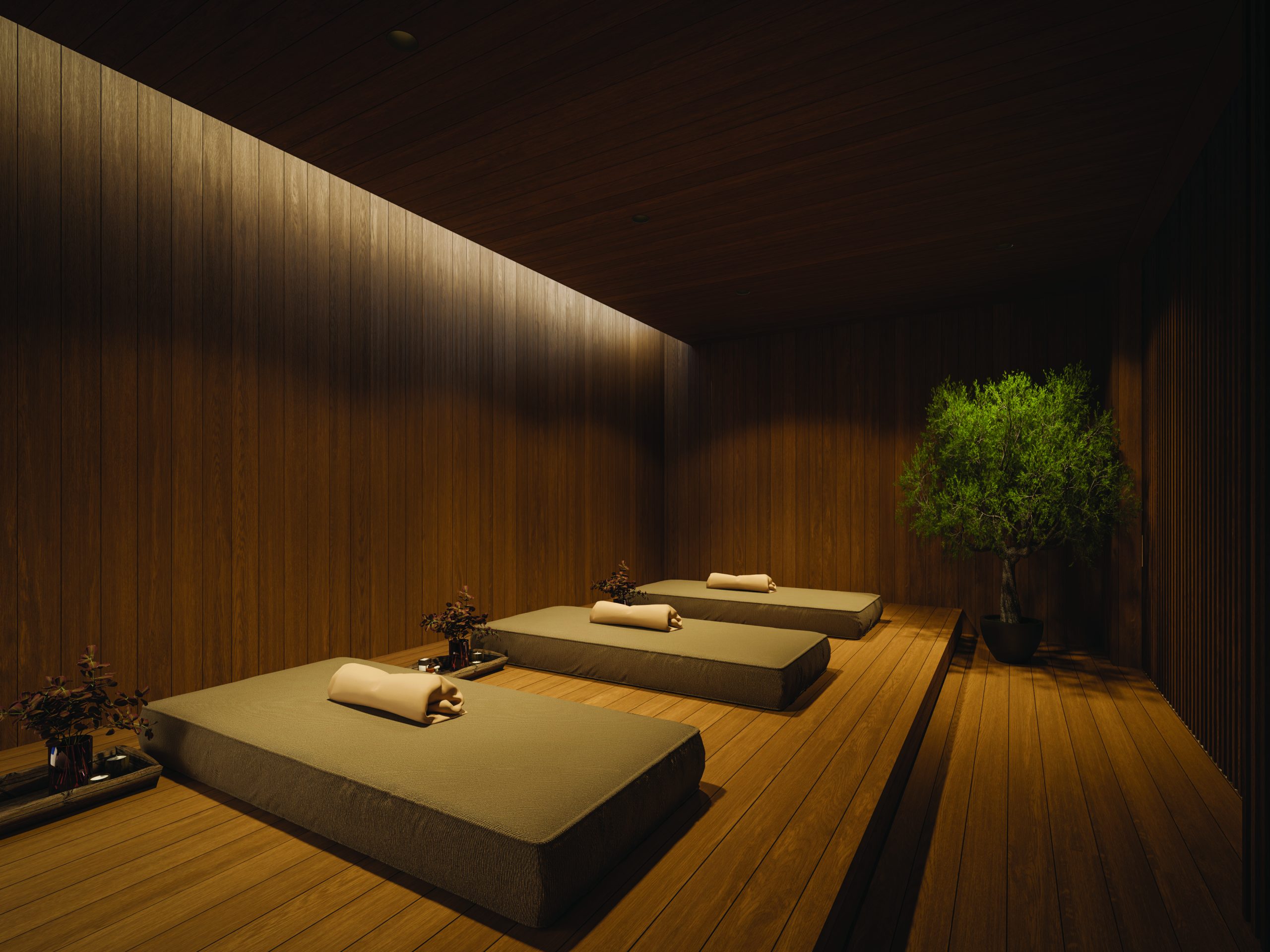 Wellness center with sauna, cold plunge, massage room, and yoga deck